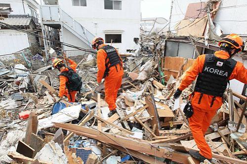 緊急救助隊は、中央119救助団およびソウル市や京畿道の救助隊員100人のほか、外交通商部の人道支援課長、職員からなる。救助隊には医療スタッフ、通訳要員6人も。15日から仙台市東部の蒲生地区で生存者捜索・救助活動を開始した。