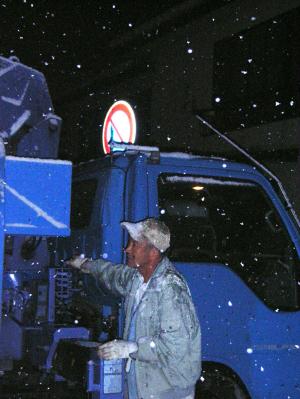 クレーンを操る車団長に、上げ、下げ、伸ばせと指示する宮城車の運転手の声が雪の降りしきる住宅街に響く。車団長の針の穴を通すような、それこそ芸術的とも言えるさばきで、ドラム缶3本が無事収まったのは19時近かった。