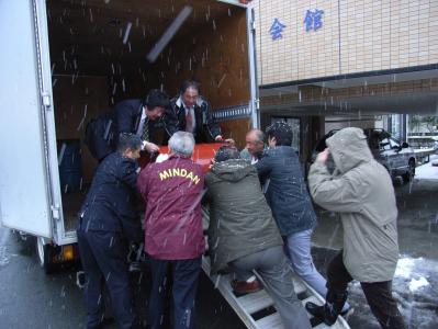 新潟車はレンタルのバンボディ。危険物取扱責任者も同乗していたはずだ。これを金団長のプリウスが先導し、大雪のなかを4時間半かけて、16時45分に到着した。ドラム缶は、積んでいた金属板を使い7、8人がかりで降ろした(写真下)。