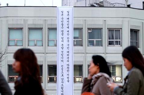 駐韓日本大使館の公報文化院(ソウル市鍾路区)は21日、「日本の大震災に対する韓国国民の皆さんの温かいご支援を、日本国民は一生忘れないでしょう。本当にありがとうございます」との内容を韓国語で記した懸垂幕を掲げ、謝意を表した。