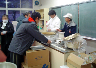 宮古市は同グループ発祥(51年前)の地であることから、「少しでも被災者の力になれれば」と考え、いち早く小学校の避難所にティッシュやミルク、ミネラルウォーターなどの日用品を差し入れた。さらに、トン汁やバーベキュー、カレーライスなどの炊き出しを実施。多い時で300食を数え、社員が交代しながら担当した。