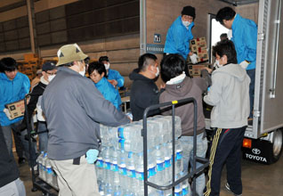 13日には、東京都大田区平和島の倉庫に運び込んだ救援物資を、東京や関東をはじめ、愛知、大阪、広島などからのボランティア約50人が加勢し大型トラックに積み込んだ。