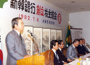 82年、341人の在日同胞が出資し、韓国初の純民間銀行である新韓銀行を設立。代表として日本で蓄積したノウハウを遺憾なく発揮し、社名のとおり韓国金融市場に新風を吹き込んだ。女性部隊「ギャル・ホース」を主軸にした親切サービス、小銭両替用の三輪電動車など、斬新なアイデアと徹底した「顧客第一主義」で「新しい金融文化の創造」を展開した。97年のIMF国際通貨危機の時には逆にチャンスととらえ、構造改革を進めることによって国際競争力を強化した。