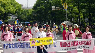 民団行進団は婦人会の兵庫本部(李慶子会長)と各支部会長らが「東日本大震災の皆さんとともに」の横断幕を掲げ、先頭に立った。その後を華やかなバトントワリング隊とチャンゴを手にした韓国伝統芸術団など約120人が続いた。
