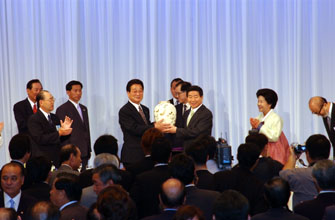 [ 民団からの記念品を受け取る盧大統領、同胞懇談会で ]