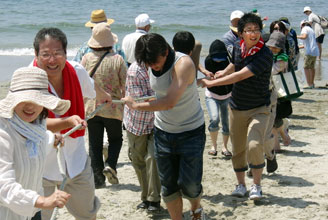 【岐阜】民団岐阜本部(韓清二団長)は23日、大人から子どもまで幅広い世代が楽しめる「地引き網体験教室」を愛知県知多郡で実施した。昨年に続き2回目。今年は近隣の愛知や福井県の団員からも参加希望が寄せられ、昨年を上回る150人余りに達した。