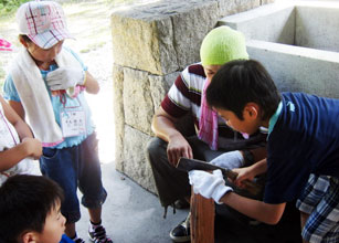 野外炊飯で初めて薪割りに挑戦したという金イスルちゃん(小2)は、「難しかったけど、おもしろかった」と笑顔をみせた。李晴菜ちゃん(小4)は、「夏休み前の行事としていつも楽しみにしている」と話しながら具材に包丁を入れていた。