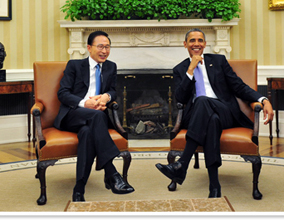 李明博大統領は国賓として米国を訪問中の13日、ホワイトハウスでのオバマ大統領との会談で2009年6月に採択した「同盟未来ビジョン」の趣旨を再確認し、韓米同盟を多元的戦略同盟に発展させていくことで一致した。韓米自由貿易協定(FTA)については、同協定の批准を機に韓米同盟を既存の軍事・安保分野から経済分野に拡大することで、両国関係を一段階発展させるとの認識を共有した(写真)。