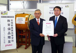 【宮城】真露ジャパン(楊仁集社長)は6日、被災地・名取市の宮城県農業高校(白石喜久夫校長)に教育備品を寄贈した。東日本大震災の復興支援の一環として、昨年6月から11月までの半年間、日本での販売商品16品目を対象に、1本当たり2円ずつを義援金として積み立てた。