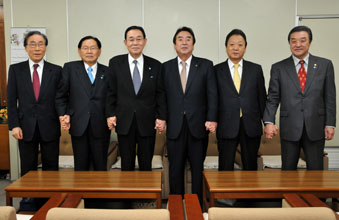 事務引き継ぎに先立ち新旧3機関長は互いに手を取り合い、この間の尽力への感謝と今後の健闘への期待を、それぞれ表明した。