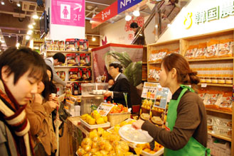 韓国農協中央会日本事務所(李安所長)が3月初めに東京・新宿のコリアタウンに開設したアンテナショップ1号店が、若い女性らでにぎわっている。