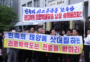 総連は4月25日、韓国大使館(新宿区四谷)に《デモ》をかけた。写真に見るように、「民族の最高尊厳を冒涜した万古逆賊李明博輩党を一掃しよう!」、「民族の太陽に指差しする李明博逆徒は天罰を受けろ!」と訴えたいらしい。「在日同胞たちの衷情の胸に刃を入れる李明博逆徒」云々というのもあった。