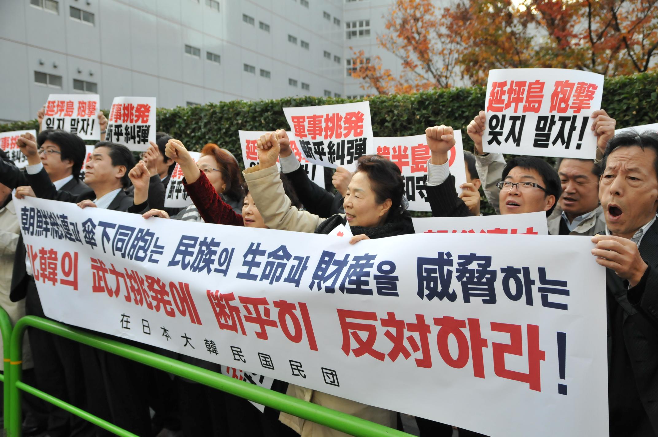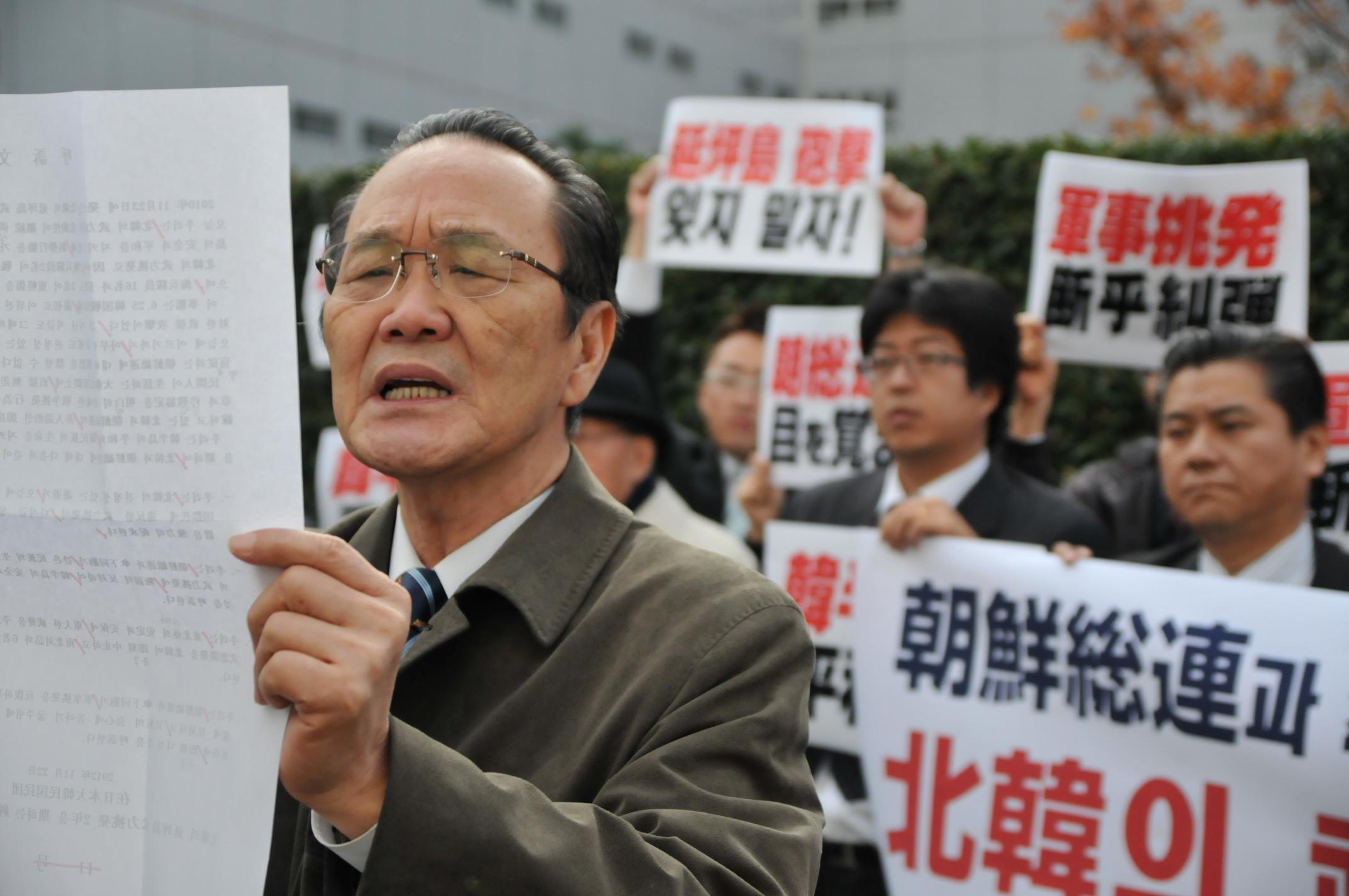 朝総連本部前に集まった50人あまりの民団役員らが、北韓の蛮行に盲従する朝総連に対して厳しく抗議するとともに、「朝総連が民族の良心に立ち返って、北韓の武力挑発を断固反対せよ」と呼びかけた。(2012.11.22)