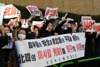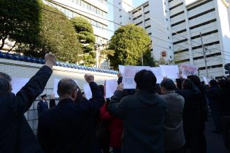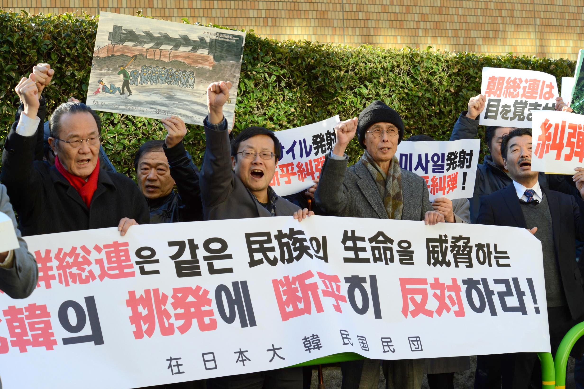 北韓が長距離弾道ミサイルを発射した事に対し民団は12日、呉公太中央団長名で「4月13日に次ぐ暴挙を、われわれは厳しく糾弾する」との声明を発表、午後には都内の役員ら50人あまりが朝総連中央本部前で抗議行動を展開した。