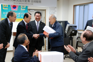 民団東京本部(金龍濤団長)と駐日韓国大使館の関係者は3日、東京の目黒支部(鄭良洙支団長)と足立支部(宋洙一支団長)の高齢団員を歳末慰問した。合同で毎年、2支部ずつを巡回している。今回の目黒で管内21支部すべてを一巡したことになる。
