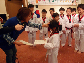 クリスマス会に先だって民団宮城文化センター「オリニ文化スクール」の発表会・修了式も行われ、今年1年間、練習してきた東日本大震災被災者を励ます「ハムケヘヨ」(朴サンヒョン作)を歌い、テコンドの演武を披露した。修了証は李花葉文教副部長から1人ひとりに手渡された。