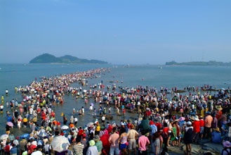 <珍島神秘の海割れ祭り>潮の干満が最も大きい時期に祭りが開かれ、独特の珍島の風景とともに多彩な海洋体験も用意されている。4月/全羅南道珍島郡義新面茅島里〜古郡面回洞里。