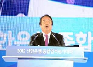 新韓銀行の12年業績評価大会が19日、ソウルのオリンピック公園競技場内で開かれ、民団中央本部の呉公太団長、在日韓国人信用組合協会の呉龍夫会長、在日韓国人本国投資協会の梁龍雄会長ら来賓をはじめ、約1万2000人が参加した。