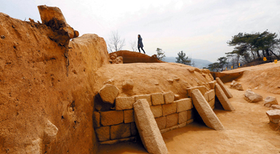 慶州で新羅時代の王陵級の墓が発見されたのは、約300年ぶりで、学界から脚光を浴びている。墓は閔哀王陵と伝わる史蹟190号古墳のような形態で、護石を基準に直径14・7メートル規模、周囲は46・3メートルの円形峰土墳。専門家による検討を経て、文化財庁が現場保存を決定、調査は中断された状態だ。