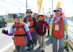 28日からはいよいよ大阪を起点として日本コースを歩き出した。初日には一般の1日ウオーカー22人が加わった。6年前にはママの翠さんにおんぶされて参加した谷口知子ちゃん(7)も元気に完歩した。