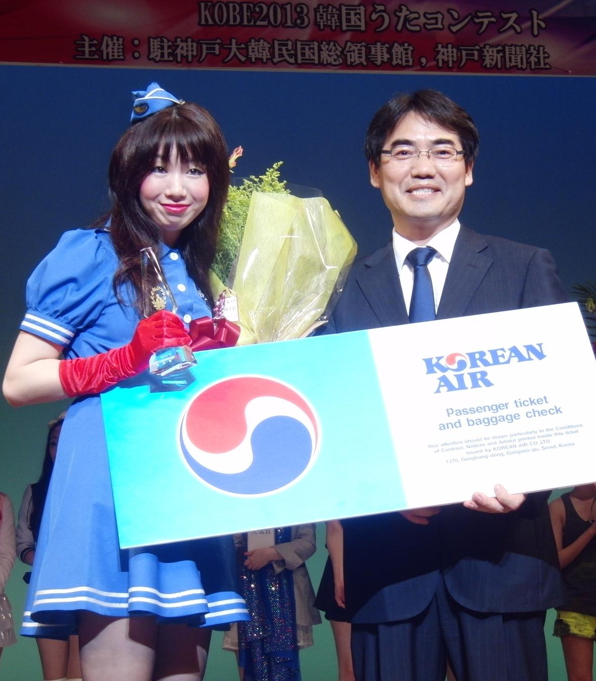 審査の結果、「大賞」に輝いたのは長岡有丘さん。副賞として大韓航空ソウル行き往復チケットと豪華ホテルの宿泊券が贈られた(写真)。