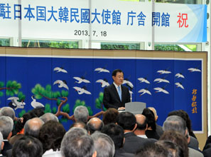 李丙大使は式典で、「(新庁舎が)1965年の韓日国交正常化以来、この間に築かれた両国の友好関係を、いっそう発展させつつ、未来へ向けて進むための『韓日友情の前進基地』になると信じている」と表明。「2015年の国交正常化50周年を契機に、『信頼』と『相互尊重』、そして『共生』に基づくグレードアップした韓日新時代を構築するため、互いに努力しなければならない」と強調した。