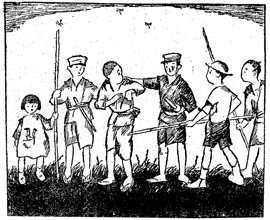 竹久夢二の挿絵「自警団遊び」(9月19日付掲載)は、子どもたちが大人をまねして竹や棒切れを振り回し、たまたま通りかかった萬ちゃんを「君の顔はどうも日本人ぢやないよ」といって困らせているもの。「子供達よ。棒切を持って自警團ごっこをするのは、もう止めませう」といさめている。