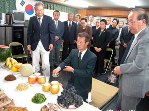 会館3階には、魚、肉、果物などを並べて祭壇がしつらえられた。震災が起きた11時58分を期して黙祷が捧げられた後、崔支団長は、船橋市内でも多くの同胞が犠牲となった歴史を繰り返さないと誓った。