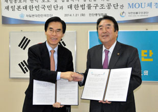 民団中央本部の呉公太団長と大韓法律救助公団の黄善泰理事長は21日、東京都港区南麻布の民団中央本部で「在日同胞の権益保護および法律福祉増進のための業務協約書(MOU)」を締結した。