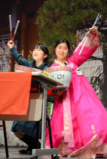 一定の台本をもとに、最後のオチは出場者の創意工夫に任された指定スキット部門「ラーメンといえばキムチでしょ!」には21組42人が出場した。小道具やBGMにも凝った元気いっぱいの発表が続いた。