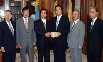 本国全土に甚大な被害をもたらせた台風14号(メミー)の復旧の一助にして欲しいと、慶尚南道道民会会長でもある民団中央本部の金昭夫副議長は19日、民団中央本部を訪れ、義援金1000万円を寄託した。