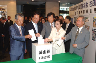[ 誠金を募金箱に入れる民団中央本部3機関長と許民団東京本部団長、金婦人会中央本部会長 ]