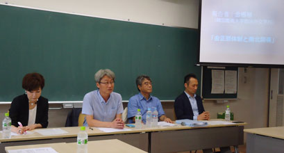 金慶珠東海大学准教授=写真左の進行で韓国慶南大学政治外交学科の金根植教授(民主平和統一諮問委員、外交部韓半島平和交渉本部諮問委員)が「金正恩体制と南北関係」について報告。フリージャーナリストの平井久志氏(元共同通信ソウル支局長、編集委員兼論説委員)と朴正鎮津田塾大学准教授(現代日韓・日朝関係)がコメントと質問を行い、参加者を交えて「やっかいな隣人=北韓・金正恩体制」とどのようにつきあっていくかについて意見交換が行われた。