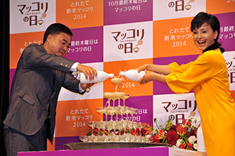 南さんは韓国農水産食品流通公社東京aTセンターの龍虎支社長と一緒に舞台に登場。グラスをタワー状に積み上げた上からマッコリを注ぎこんで「マッコリタワー」を完成させた。この後、南さんをイメージした柚子茶ジャムをジンジャーエールとマッコリで割った「スノービューテイカクテル」で乾杯した。