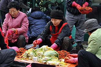 韓国の冬は非常に厳しい寒さです。むかしは冬に野菜を得ることはむずかしいことでした。ですから冬の間に食べるキムチを、一度に大量に漬けて保存しておきました。なにせ大量ですから、家族だけではぜんぜん手が足りません。そこで、こっちの家が終わると次はあっちの家、というように近所の人たちがお互いに助け合ってキムチを漬けてきました。この風習を「キムジャン」というのです。