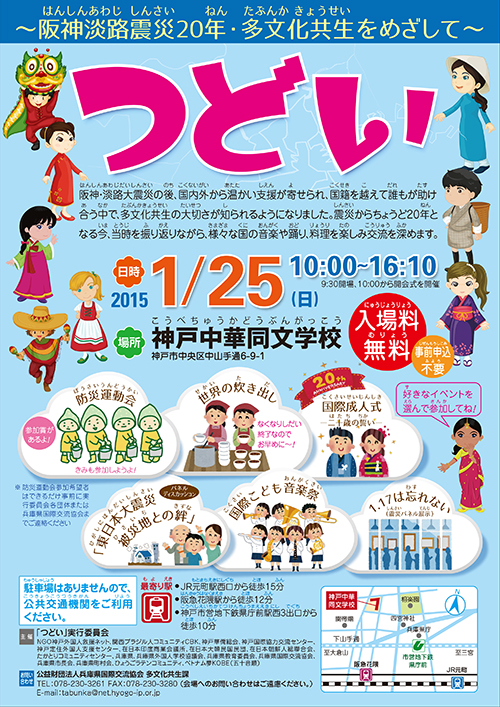 そうして育まれた兵庫県の土壌を原動力とし、このたび、兵庫県、神戸市、教育委員会などの行政と韓国民団兵庫県本部や神戸華僑総会、ブラジル人コミュニティーなどの外国人団体とが共同で実行委員会(合計17団体・実行委員長は兵庫県国際交流協会の齋藤富雄理事長)を構成し、25日に中華同文学校で「つどい 阪神・淡路大震災20年・多文化共生をめざして」を開催することが決定している。