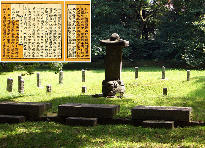 | 済州島の三神人の始祖誕生神話の地「三姓穴」。切り込み写真は日本国からやって来た三女神を記載した「高麗史」 |