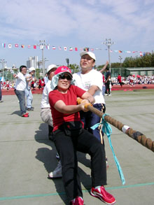 [ 支部対抗の綱引きで思いっきり汗を流す団員(東京) ]