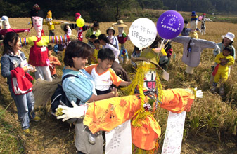 黄金色の実りを迎えた田圃で、現代的に装飾された案山子(かかし)と伝統の民俗ノリ、バッタ捕り体験行事で家族連れが楽しいひとときを送っている。東釜山農協の主催で26日に釜山の機張郡長安邑一帯で行われた行事は、多くの家族連れでにぎわった。環境保護の重要性を教えながら自然との調和を体験させる貴重な時間となった。展示された案山子を見る都会っ子の顔は興味津々だ。