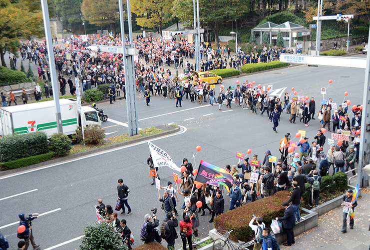 出発地点の新宿中央公園は「MAKE SOME NOISE TOKYO」(東京でいろんな声を上げよう)の文字が印刷された風船を持つ人たちであふれかえった。