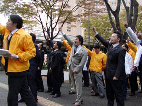 今回は全国各地から50人余りの青年会と学生会の代表が駆けつけた。 メンバーは都庁での示威行動に先立って新宿、渋谷、銀座の目抜きどおり6カ所に分散しビラ約3000枚を道行く都民に配った。ビラは石原知事による一連の「暴言」「妄言」が多文化共生を妨げている事実を指摘、都民に「本当に石原さんでいいんですか?」と訴えかけた内容。