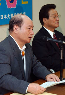 [ 在日同胞歴史資料館開設推進委員会発足に際し記者会見する金宰淑民団中央本部団長(中央) ]