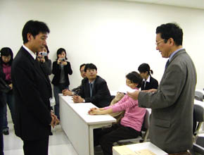 [ 韓国のNGO関係者が見守るなか石原都知事への抗議文を読みあげる韓聖さん(右) ]