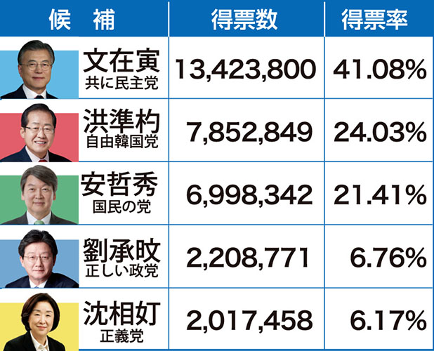 41・08%得票 9日に投票された第19代韓国大統領選挙は、同日午後8時から開票し、10日未明に進歩(革新)系最大野党「共に民主党」の文在寅候補(前代表)が、中道系「国民の党」の安哲秀候補(元代表)、保守系旧与党「自由韓国党」の洪準杓候補(慶尚南道知事)らを制し、有権者3267万2010人の投票のうち、1342万3800票、得票率41・08%を獲得して当選した。文候補は前回の第18代選挙に続き、二度目の挑戦で初当選した。選挙戦開始当初は、文候補と安候補による二人の接戦と見られたが、数回の候補者テレビ討論などを通じて、文候補の支持率はトップを維持し続けたものの、追い上げていた安候補の支持率が急速に低下。その結果、2位の洪候補とは557万票の大差をつけて勝利した。中央選挙管理委員会は10日午前8時、文候補の当選を議決する全体会議を開き、可決後に直ちに大統領の任期が始まった。