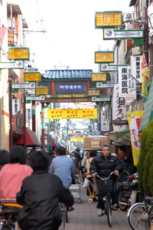 通称コリアタウンは、御幸通り商店街を指す。済州道との定期航路が結ばれていたことや、平野川の改修工事に従事した同胞が集団で住んだことなどから、「猪飼野」と呼ばれたこの地域は、圧倒的に同胞が多かった。同胞の食生活を満たすために、御幸通り商店街の裏通りに韓国食材を扱う店が並んだのが「朝鮮市場」の始まりだという。商売を広げながら表通りに店を構えていったのが今のコリアタウンにつながる。