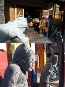 商店街を歩けば、済州道出身者が多いのか、石でできたトルハルバンや、長丞など韓国情緒たっぷりの演出も楽しい。