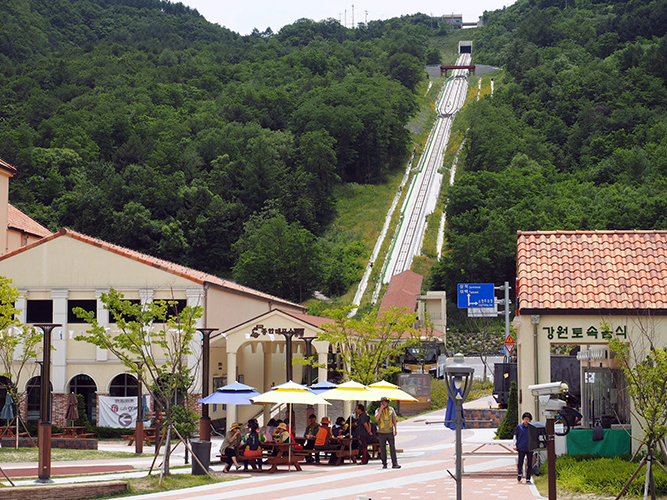 現在、チューチューステーションから桶里駅までは、観光用インクラインが用意されている。スイス製の車両で、大韓民国初の山岳観光鉄道という触れ込みだ。だが、安全性に問題があったのか、緊急点検整備として長期運休中。代わりにシャトルバスが運行されている。