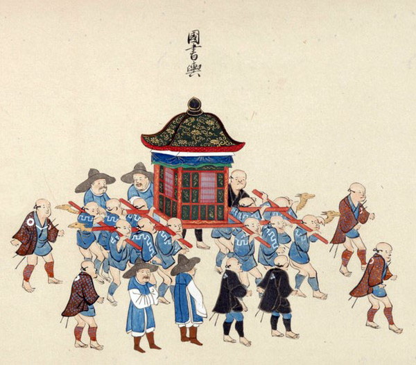 朝鮮通信使参着帰路行列図=上が正使、下は国書(高麗美術館所蔵)