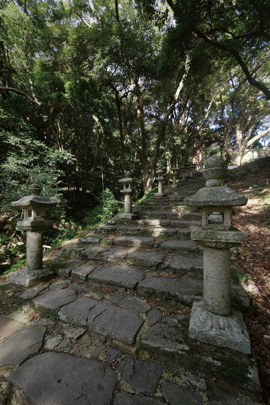 万松院から金石城に戻るところに、清水山城跡への道標があった。この山城(210㍍)からだと厳原港全体を俯瞰できるだろう。本丸への登り口で撮影スポットを見つけた。ここでは日差しが強いことが上手く作用して、コントラストの中に厳原港の入江が浮かび上がっていた。