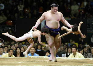 史上初めて韓国で大相撲が行われた2月14日、ソウル奨忠体育館の客席を埋めた5500人の観衆たちの反応は期待以上に熱かった。韓国の学生シルム王者出身の春日王(本名・金成澤)がソウル日本人学校の児童2人を軽々と持ち上げて観客を沸かせた。韓国での大相撲は、今年1月の日本大衆文化第4次開放によって急速に進む日本文化の流入を端的にあらわした一例とも言える。